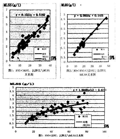 以上三圖及對應關系式表明:當SVI<120時,污泥沉降比與MLSS呈線性關系,其中,當SVI<80時,MLSS值隨污泥沉降比變化的斜率比80<SVI<120時的大,當SVI>120時,污泥沉降比與MLSS呈對數關系。這說明:當SVI值比較穩定的情況下,污泥濃度與污泥沉降比之間存在著穩定的對應關系。隨著SVI值的階段性增大,污泥濃度隨污泥沉降比變化的幅度越來越小。