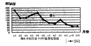 污泥沉降比與污泥濃度的對應關系,主要因SVI值的改變而發生變化,SVI值大小的改變,除受生物增長期和一些偶然因素影響外,溫度是影響SVI值大小的主要因素。下圖為一年四季中不同月份下所對應的SVI值情況。