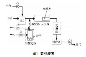 經過燃燒實驗測得煙氣中的NOx濃度為126ppm,砷濃度為11.93ppm,使煙氣以100~200m3 /h的速度通過尺寸為50×30×1(mm)的V2O5/TiO2催化劑,NH3/NOx為 1.0,反應溫度控制在350℃,反應時間62小時。實驗裝置如圖1所示。