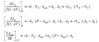 其中:NB—煙氣中的NOx濃度(ppm);AB—煙氣中NH3的濃度(ppm);Ns—催化劑表面的NOx濃度(ppm);KfN—催化劑表面NOx傳質系數(m/h); P—催化劑表面的活性區域(ppm);AV—表面速度(m/h);Aads —參與反應的NH3的濃度(ppm); K1,K3,K4—反應速率常數;KfA—催化劑表面NH3傳質系數(m/h);AS—催化劑表面NH3的濃度(ppm)。