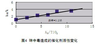 以As/TiO2為橫軸,k0/k為縱軸做砷中毒造成的催化劑活性變化圖 (見圖4)。