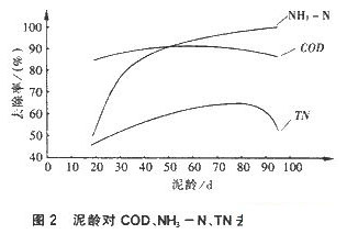 由圖2可以看出,隨泥齡的增加,NH3-N的去除率隨之提高,說明活性污泥齡越長,進入氧化溝中的食料相對越少,系統在低負荷下運行,硝化作用比較完全。COD在分析的泥齡范圍內(18~95 d)并無明顯變化。