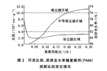 由于三溝式氧化溝具有污泥好氧穩定的特點,因此從圖中可看出未加絮凝劑的污泥比阻也較低,屬于中等難過濾污泥,投加0.05%PAM即可成為易過濾污泥。常規活性污泥法的污泥比阻為(2.74~2.94)×1013cm/g,由此可看出三溝式氧化溝剩余污泥脫水性能非常好。