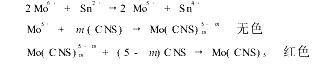 濾液中Mo離子的測定是用硫氰酸鹽比色法[6],該方法是根據在5%~7%的硝酸介質中,用二氯化錫還原Mo6+為Mo5+,Mo5+與硫氰酸鹽生成橙紅色的Mo(CNS)5絡合物,借此進行比色測定.其反應如下: