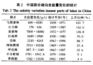 滇池水系也受到了重金屬的污染,以草海為甚,主要污染元素為sn、Pb、Cr、H。據調查,近30多年來,中國部分湖泊含鹽量明顯增加,特別是西北地區湖水變成趨勢很明顯(表2),如內蒙古的烏梁素海,1958年湖水的含鹽量為60g/t,1971年已升為439g/t,13年來湖水含鹽量增加了6.3倍,由淡水湖變成了咸水湖。