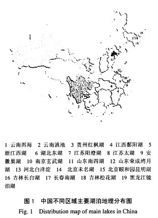 本研究主要搜集了貴州紅楓湖、云南洱海、滇池的內草海~u#t-草海、江西鄱陽湖、浙江西湖、湖北東湖、江蘇陽澄湖、江蘇太湖、江蘇梅梁湖、上海淀山湖、安徽巢湖、南京玄武湖、山東榮城月湖、山東南四湖、河北白洋淀、北京未明湖、北京昆明湖、長春南四湖、吉林長白湖、吉林松花湖、黑龍江鏡泊湖21個湖泊的資料。圖1為所研究湖泊的區域分布圖。這些湖泊主要分布在東部和南部沿海地區。表1是中國主要湖泊底泥中重金屬含量的平均值,從平均值分析,可以看出,滇池中Cu、Zn、Pb、Cd和Ni的濃度在這些湖泊中是最高的,分別為:920,2208,647,164.8和466mg/kg,底泥中Cr的最高濃度出現在洱海,為130mg/kg,Hg的最高濃度出現在松花江,為2.10mg/kg,As的最高濃度出現在太湖,為21.4mg/kg。Cu、Zn、Cr、Pb、Cd、Hg、Ni和As的最低濃度分別出現在北京未名湖12.0mg/kg、山東月湖l7.3mg/kg、吉林長白湖35.7mg/kg、山東月湖6.7mg/kg、山東月湖0.15mg/kg、江西鄱陽湖0.03mg/kg、吉林長白湖20.0mg/kg、黑龍江鏡泊湖7_3mg/kg。由此可以看出,滇池、太湖、松花湖底泥重金屬含量較高,污染較嚴重,而月湖、長白湖、鏡泊湖和鄱陽湖底泥某種重金屬含量較低,尤其是月湖,3種重金屬元素濃度均為最低值。對所研究湖泊不同采樣點底泥重金屬濃度數據進行處理,得出中國湖泊底泥重金屬含量范圍列于表2。研究表明,中國湖泊底泥中重金屬含量變化較大,一方面是不同重金屬元素的濃度有很大差異,底泥中濃度最大值為重金屬Zn,其最高濃度2208mg/kg;濃度最低的Hg,其最小濃度為0.01mg/kg,兩者差值高達2000mg/kg之多。另一方面,同一種重金屬在不同湖泊底泥中的差值也很大:差值最大的重金屬為Zn,其濃度最大值與最小值相差2206.4mg/kg;相差倍數最多的是Hg的濃度,最大值是最小值的4609倍。可見,由于湖泊所在區域不同決定了湖泊及其周圍的自然生態環境也不相同,因此所受到重金屬污染的程度有較大差異。從表2中還可以看出,中國湖泊底泥中平均濃度最高的重金屬是Zn(160.64mg/kg),其次為:Cr(67,55mg/kg)>Ni(53.02mg/kg)>Cu(48.03mg/kg)>Pb(38.03mg/kg)>As(13.55mg/kg)>Cd(O.94mg/kg),最小為Hg(0.64mg/kg),但這并不代表各種重金屬對水體造成的污染程度。各種重金屬元素在生物體內需求量和毒性是不同的,一些重金屬是生命正常生理代謝所必不可少的,稱之為生命必需微量元素,如Cu、Zn,生命必需微量重金屬元素超過一定劑量時,可能對生物體產生毒害或負面影響。其他一些重金屬元素,如Cr、Cd、Hg、Pb、As等是生命非必需重金屬元素,環境中的這些重金屬元素往往對生物和人體具有很大的毒害作用。因此衡量各種重金屬在底泥中是否超標的標準值也有很大差別。