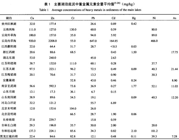 重金屬污染問題是我國水環境研究人員最早關注的重要問題之一,由于底泥在水環境中的重要作用,多數學者在研究水相中的重金屬污染狀況時,同時也會對水體底泥的重金屬污染狀況進行同步采樣分析。20世紀80年代以來,廣大學者對我國不同地理區域的湖泊底泥重金屬污染狀況進行了較廣泛的研究,研究所涉及的重金屬元素包括Fe、Mn、Hg、Cd、Zn、Cu、Cr、As、Ni、Se、Co、Ni等,積累了豐富的數據。但是,以前的研究主要是針對某一具體區域的某一具體湖泊而進行底泥重金屬污染的實驗研究,到目前為止,對我國不同區域的眾多湖泊底泥的重金屬含量及污染情況從整體上進行比較和分析的相關資料還比較少。本文通過對不同區域湖泊重金屬元素(主要為Cu、Cd、Pb、Zn、HAs、Ni、Cr8種重金屬)含量及背景值數據的搜集和處理加工,對我國湖泊底泥中重金屬污染情況進行了比較和分析,并對重點湖泊底泥重金屬污染程度作出了評價。