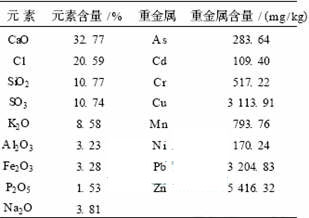 樣品采自華東某生活垃圾焚燒廠。分別采集垃圾焚燒系統的煙道飛灰和布袋飛灰,在實驗室均勻混合后,在105℃烘干24h。冷卻后研磨混合均勻,用XRF- 1700型X射線熒光光譜儀測定其主要元素含量。采用改進的ASTMD6357-00a方法[3]消解飛灰和水洗飛灰樣品,過濾(0.45μm)后采用 PEElan6000型感應耦合等離子體原子發射光譜(重金屬)測定重金屬含量(表1)。