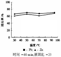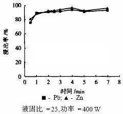 將浸出劑加熱到固定溫度,加入飛灰后浸出60min。結果表明,隨著處理溫度的升高,浸出率略有提高(圖1)。當處理溫度從30℃提高到95℃時,鋅的浸出率從59.94%提高到68.10%,鉛的浸出率從65.89%提高到70.23%。在傳統加熱過程中,能量是通過熱的對流、傳導和輻射從材料表面傳遞給材料體的。溫度影響試驗說明傳統加熱的“熱效應”不能顯著提高飛灰中重金屬的溶解。