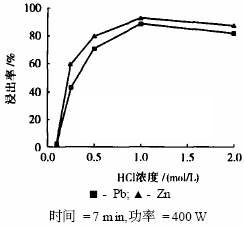 在其它(ta)浸(jin)出(chu)(chu)條件不變(bian)的(de)(de)(de)情況下,比較(jiao)不同濃(nong)度(du)(du)(du)的(de)(de)(de)各種浸(jin)出(chu)(chu)劑(ji)對鋅(xin)和(he)鉛的(de)(de)(de)浸(jin)出(chu)(chu)率(lv)。浸(jin)出(chu)(chu)劑(ji)濃(nong)度(du)(du)(du)小于1M時(shi)浸(jin)出(chu)(chu)效率(lv)和(he)浸(jin)出(chu)(chu)劑(ji)濃(nong)度(du)(du)(du)呈強(qiang)的(de)(de)(de)正相關(guan)性,當濃(nong)度(du)(du)(du)繼續增(zeng)大時(shi)固(gu)液分離變(bian)得困難。對于1mol/L的(de)(de)(de)不同浸(jin)出(chu)(chu)劑(ji),鋅(xin)浸(jin)出(chu)(chu)率(lv)結果(guo)為(wei)硫酸(suan)(suan)81.7%、鹽(yan)酸(suan)(suan)68.4%、硝(xiao)酸(suan)(suan)63.5%、醋酸(suan)(suan)59.5%、氫氧(yang)(yang)化(hua)鈉(na) 8.7%;Pb浸(jin)出(chu)(chu)率(lv)分別為(wei)硫酸(suan)(suan)5.2%、鹽(yan)酸(suan)(suan)74.5%、硝(xiao)酸(suan)(suan)65.0%、醋酸(suan)(suan)60.3%、氫氧(yang)(yang)化(hua)鈉(na)26.7%。綜合考慮對Pb和(he)Zn的(de)(de)(de)浸(jin)出(chu)(chu)效果(guo),選擇 1mol/LHCl作為(wei)后(hou)續試驗浸(jin)出(chu)(chu)劑(ji)。