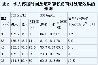 曝氣池的水力停留時間(HRT)及填料容積負荷對該工藝處理效果的影響比較明顯。由表2可知,當流量為1 m3/h的COD、BOD去除率最高分別為80%和87%。在各種不同水力停留時間下的出水COD變化在30~70 mg/L之間,BOD變化在10~20 mg/L的范圍,均達到了國家二級排放標準。根據中試廠原設計,該裝置可承受進水COD負荷范圍為2~20 kgCOD/(m3.d)。但由于原水濃度太低,進水COD為150 mg/L左右,致使反應器中生物膜養料不充足。為了保證工況試驗條件,必須靠提高流量來增加負荷,而提高流量則縮短了曝氣時間,影響了處理效果。當填料負荷為10.5 kgCOD/(m3.d)時,COD去除率只達到69%,即使這樣,處理負荷也較傳統工藝大有提高。