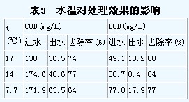 水溫對該工藝處理影響不大。由表3可知,當水溫高于10 ℃時,COD、BOD去除率基本維持不變;當水溫低于8 ℃時,COD、BOD去除率才有明顯下降,但適當延長曝氣時間就可使出水水質變好,可見該工藝抗低溫的能力是很強的。