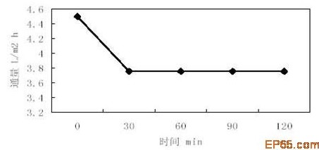 圖4 是在(zai)(zai)(zai)H = △ 30cm 時混合(he)(he)(he)(he)液(ye)(ye)過(guo)(guo)(guo)濾時的(de)(de)(de)(de)膜(mo)(mo)(mo)(mo)通量(liang)(liang)(liang)曲線,可以看到(dao)在(zai)(zai)(zai)開始過(guo)(guo)(guo)濾時,膜(mo)(mo)(mo)(mo)的(de)(de)(de)(de)通量(liang)(liang)(liang)僅為(wei)4.5L/m2·h,半(ban)小時后(hou),通量(liang)(liang)(liang)降(jiang)到(dao)3.75L/m2·h,并且能(neng)(neng)(neng)長(chang)時間(jian)的(de)(de)(de)(de)維持(chi)在(zai)(zai)(zai)這(zhe)個水(shui)(shui)(shui)(shui)平(ping)上,這(zhe)和(he)(he)(he)(he)清水(shui)(shui)(shui)(shui)實(shi)驗的(de)(de)(de)(de)高(gao)(gao)通量(liang)(liang)(liang)形成巨(ju)(ju)大(da)的(de)(de)(de)(de)反差。這(zhe)是否是由(you)(you)于(yu)(yu)PET 聚(ju)(ju)(ju)酯(zhi)編織膜(mo)(mo)(mo)(mo)的(de)(de)(de)(de)疏(shu)水(shui)(shui)(shui)(shui)性(xing)所(suo)導(dao)致(zhi)有(you)(you)(you)待研究(jiu)。據文(wen)獻,聚(ju)(ju)(ju)酯(zhi)分(fen)子(zi)(zi)結(jie)(jie)構(gou)對(dui)稱(cheng),結(jie)(jie)晶(jing)度(du)較(jiao)高(gao)(gao),結(jie)(jie)構(gou)中又沒有(you)(you)(you)高(gao)(gao)極(ji)(ji)性(xing)基(ji)團,因此(ci)親水(shui)(shui)(shui)(shui)性(xing)較(jiao)差[10]。當過(guo)(guo)(guo)濾混合(he)(he)(he)(he)液(ye)(ye)時,膜(mo)(mo)(mo)(mo)表(biao)(biao)面附近的(de)(de)(de)(de)水(shui)(shui)(shui)(shui)分(fen)子(zi)(zi)的(de)(de)(de)(de)Gibbs 自由(you)(you)能(neng)(neng)(neng)(G)取決于(yu)(yu)水(shui)(shui)(shui)(shui)分(fen)子(zi)(zi)和(he)(he)(he)(he)蛋(dan)白質之間(jian)以及(ji)水(shui)(shui)(shui)(shui)分(fen)子(zi)(zi)和(he)(he)(he)(he)膜(mo)(mo)(mo)(mo)表(biao)(biao)面之間(jian)的(de)(de)(de)(de)氫鍵和(he)(he)(he)(he)極(ji)(ji)性(xing)作(zuo)用,疏(shu)水(shui)(shui)(shui)(shui)性(xing)、非(fei)極(ji)(ji)性(xing)膜(mo)(mo)(mo)(mo)表(biao)(biao)面與水(shui)(shui)(shui)(shui)無這(zhe)種相互作(zuo)用,結(jie)(jie)果使(shi)膜(mo)(mo)(mo)(mo)表(biao)(biao)面水(shui)(shui)(shui)(shui)分(fen)子(zi)(zi)的(de)(de)(de)(de)G 值高(gao)(gao)于(yu)(yu)主體溶(rong)液(ye)(ye)中水(shui)(shui)(shui)(shui)分(fen)子(zi)(zi)的(de)(de)(de)(de)G 值,使(shi)得(de)水(shui)(shui)(shui)(shui)溶(rong)液(ye)(ye)中疏(shu)水(shui)(shui)(shui)(shui)性(xing)的(de)(de)(de)(de)蛋(dan)白質優先迅速吸附于(yu)(yu)膜(mo)(mo)(mo)(mo)表(biao)(biao)面[11,12]。其次,垃(la)圾(ji)滲(shen)濾液(ye)(ye)的(de)(de)(de)(de)營(ying)養配比不合(he)(he)(he)(he)理及(ji)含有(you)(you)(you)大(da)量(liang)(liang)(liang)不易(yi)生(sheng)物(wu)(wu)降(jiang)解的(de)(de)(de)(de)有(you)(you)(you)機(ji)物(wu)(wu),使(shi)得(de)混合(he)(he)(he)(he)液(ye)(ye)中的(de)(de)(de)(de)生(sheng)物(wu)(wu)難以適應,混合(he)(he)(he)(he)液(ye)(ye)的(de)(de)(de)(de)粘性(xing)較(jiao)大(da),大(da)量(liang)(liang)(liang)的(de)(de)(de)(de)胞外(wai)聚(ju)(ju)(ju)合(he)(he)(he)(he)物(wu)(wu)(EPS)生(sheng)成。這(zhe)樣(yang),PET 聚(ju)(ju)(ju)酯(zhi)編織膜(mo)(mo)(mo)(mo)在(zai)(zai)(zai)混合(he)(he)(he)(he)液(ye)(ye)過(guo)(guo)(guo)濾時,大(da)量(liang)(liang)(liang)EPS、壞死(si)的(de)(de)(de)(de)生(sheng)物(wu)(wu)細(xi)胞和(he)(he)(he)(he)其它蛋(dan)白質類物(wu)(wu)質會(hui)瞬間(jian)吸附在(zai)(zai)(zai)膜(mo)(mo)(mo)(mo)表(biao)(biao)面,阻塞(sai)了(le)過(guo)(guo)(guo)水(shui)(shui)(shui)(shui)通道,蛋(dan)白質和(he)(he)(he)(he)膜(mo)(mo)(mo)(mo)的(de)(de)(de)(de)疏(shu)水(shui)(shui)(shui)(shui)性(xing)使(shi)得(de)水(shui)(shui)(shui)(shui)分(fen)子(zi)(zi)很(hen)難靠近膜(mo)(mo)(mo)(mo)表(biao)(biao)面,細(xi)絲(si)的(de)(de)(de)(de)編制結(jie)(jie)構(gou)和(he)(he)(he)(he)膜(mo)(mo)(mo)(mo)壁(bi)較(jiao)厚(hou)加劇了(le)這(zhe)一(yi)過(guo)(guo)(guo)程。當PET聚(ju)(ju)(ju)酯(zhi)膜(mo)(mo)(mo)(mo)在(zai)(zai)(zai)清水(shui)(shui)(shui)(shui)實(shi)驗時,由(you)(you)于(yu)(yu)水(shui)(shui)(shui)(shui)中沒有(you)(you)(you)或極(ji)(ji)少蛋(dan)白質,難以對(dui)水(shui)(shui)(shui)(shui)分(fen)子(zi)(zi)的(de)(de)(de)(de)通過(guo)(guo)(guo)構(gou)成阻礙(ai)。這(zhe)樣(yang),PET 聚(ju)(ju)(ju)酯(zhi)膜(mo)(mo)(mo)(mo)在(zai)(zai)(zai)應用于(yu)(yu)清水(shui)(shui)(shui)(shui)實(shi)驗和(he)(he)(he)(he)混合(he)(he)(he)(he)液(ye)(ye)過(guo)(guo)(guo)濾時就會(hui)形成巨(ju)(ju)大(da)的(de)(de)(de)(de)反差。實(shi)驗發現(xian):膜(mo)(mo)(mo)(mo)絲(si)在(zai)(zai)(zai)混合(he)(he)(he)(he)液(ye)(ye)中抖(dou)動(dong)能(neng)(neng)(neng)提高(gao)(gao)膜(mo)(mo)(mo)(mo)通量(liang)(liang)(liang)和(he)(he)(he)(he)增強透水(shui)(shui)(shui)(shui)穩定性(xing),曝(pu)氣沖刷不會(hui)對(dui)膜(mo)(mo)(mo)(mo)造成傷(shang)害和(he)(he)(he)(he)斷絲(si)現(xian)象,并且對(dui)出水(shui)(shui)(shui)(shui)水(shui)(shui)(shui)(shui)質影響很(hen)小。本實(shi)驗的(de)(de)(de)(de)膜(mo)(mo)(mo)(mo)下反曝(pu)氣管一(yi)直處于(yu)(yu)工作(zuo)狀(zhuang)態,曝(pu)氣強度(du)為(wei)1.0m3/h。
