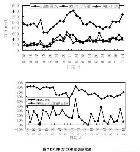 圖(tu)7 是DMBR 在(zai)(zai)實驗期(qi)間對(dui)(dui)(dui)COD 的(de)(de)去(qu)除(chu)(chu)情況。從圖(tu)上可(ke)以看出(chu)DMBR 的(de)(de)進水(shui)COD 變化幅度較大,在(zai)(zai)625.8625.8~1420mg/L 之(zhi)間,平(ping)均值(zhi)為(wei)974.4mg/L。出(chu)水(shui)COD 在(zai)(zai)136.5~428.9mg/L 之(zhi)間,平(ping)均值(zhi)300.44mg/L,DMBR 對(dui)(dui)(dui)COD 的(de)(de)平(ping)均去(qu)除(chu)(chu)率為(wei)69.23%。從圖(tu)上可(ke)以看出(chu),DMBR 在(zai)(zai)前(qian)一段時間的(de)(de)出(chu)水(shui)COD 相對(dui)(dui)(dui)較低(di),并(bing)且去(qu)除(chu)(chu)率呈下降(jiang)趨勢,這(zhe)和這(zhe)段時間的(de)(de)進水(shui)采用(yong)人工(gong)配水(shui)和垃圾滲濾液的(de)(de)混(hun)合投加有(you)(you)(you)(you)關系,一方面有(you)(you)(you)(you)易生(sheng)物(wu)降(jiang)解的(de)(de)人工(gong)配水(shui)的(de)(de)存(cun)在(zai)(zai)使(shi)得出(chu)水(shui)COD 較低(di),另一方面垃圾滲濾液對(dui)(dui)(dui)混(hun)合液生(sheng)物(wu)相的(de)(de)沖擊使(shi)得COD 去(qu)除(chu)(chu)率有(you)(you)(you)(you)所下降(jiang)。當系統補(bu)加了(le)部(bu)分(fen)污泥后,COD 的(de)(de)去(qu)除(chu)(chu)率又有(you)(you)(you)(you)了(le)回升。此外,通過對(dui)(dui)(dui)DMBR 上清液和膜(mo)出(chu)水(shui)COD 的(de)(de)監測,膜(mo)對(dui)(dui)(dui)上清液COD 有(you)(you)(you)(you)部(bu)分(fen)截留作用(yong),平(ping)均值(zhi)為(wei)18.27%,但卻不及其它(ta)動態膜(mo)[6],究其原因,可(ke)能(neng)是PET 膜(mo)對(dui)(dui)(dui)有(you)(you)(you)(you)機(ji)物(wu)吸附性更(geng)強,膜(mo)絲更(geng)密集有(you)(you)(you)(you)機(ji)物(wu)更(geng)難通過的(de)(de)結果。