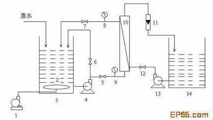 1.空氣壓縮機;2.曝氣頭;3.生物(wu)反(fan)應器;4.污泥(ni)泵(beng);5,6,7,12.閥門;8,9.壓力表;10.超濾膜組件(jian);11.流量計;13.反(fan)沖洗泵(beng);14.清(qing)水箱