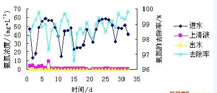 在膜生物反應器(qi)中,由(you)于膜的(de)截留(liu)使(shi)得微(wei)生物全部停(ting)留(liu)在生物反應器(qi)中,污泥沒(mei)有(you)(you)發生流(liu)失。而且污泥齡長,硝化(hua)細菌濃度(du)高,溶解氧充(chong)足,有(you)(you)利于硝化(hua)細菌的(de)生長與繁殖,因(yin)此(ci),系(xi)統(tong)對氨(an)氮的(de)去(qu)除率(lv)高。圖4表(biao)示了本系(xi)統(tong)進水、上(shang)清(qing)液和膜出水的(de)氨(an)氮濃度(du)隨時間的(de)變(bian)化(hua)情(qing)況以及系(xi)統(tong)對氨(an)氮的(de)去(qu)除率(lv)。由(you)圖可以看出:氨(an)氮的(de)去(qu)除主要是(shi)靠生物降解來
