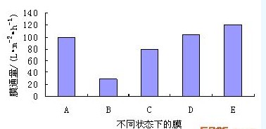 (2)膜(mo)長期運行會(hui)產生(sheng)污染(ran),采用(yong)物理(li)清洗(xi)和化學清洗(xi)相結合的清洗(xi)方法(fa),可(ke)以(yi)使膜(mo)通量(liang)恢(hui)(hui)復到理(li)想的效果(guo)。用(yong)1%的NaClO溶液和1%的NaOH溶液浸泡以(yi)后,膜(mo)通量(liang)可(ke)恢(hui)(hui)復到120%。