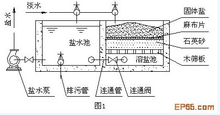 接下來探討溶(rong)液(鹽(yan)水(shui))的(de)(de)濃化。溶(rong)液的(de)(de)濃化相對簡單,可以這(zhe)樣做:先打(da)開連通閥(參見(jian)圖1),然后(hou)舀鹽(yan)水(shui)池里(li)的(de)(de)稀鹽(yan)水(shui)澆在溶(rong)鹽(yan)池里(li)的(de)(de)固體鹽(yan)上(shang),邊澆邊測鹽(yan)水(shui)的(de)(de)濃度,直到符合要(yao)求為(wei)止。