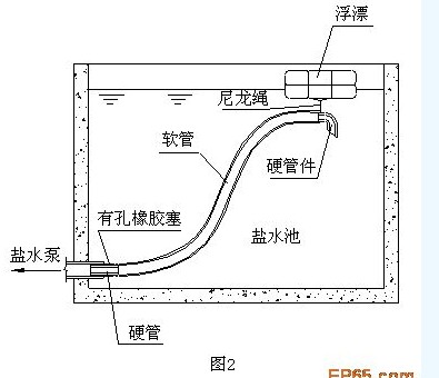 為了消(xiao)(xiao)除鹽(yan)(yan)水(shui)(shui)池(chi)靜壓(ya)強(qiang)對鹽(yan)(yan)水(shui)(shui)泵出(chu)口(kou)(kou)(kou)壓(ya)頭的(de)(de)(de)(de)(de)影響(xiang),筆者設計了一(yi)(yi)套保(bao)持鹽(yan)(yan)水(shui)(shui)泵入口(kou)(kou)(kou)壓(ya)強(qiang)恒(heng)定裝置如圖2:制作(zuo)一(yi)(yi)個浮(fu)漂,用尼龍(long)繩將一(yi)(yi)根軟(ruan)(ruan)管(guan)的(de)(de)(de)(de)(de)一(yi)(yi)端(duan)吊掛在浮(fu)漂的(de)(de)(de)(de)(de)下方,軟(ruan)(ruan)管(guan)的(de)(de)(de)(de)(de)另一(yi)(yi)端(duan)固(gu)結在鹽(yan)(yan)水(shui)(shui)池(chi)出(chu)口(kou)(kou)(kou)處(注意軟(ruan)(ruan)管(guan)與鹽(yan)(yan)水(shui)(shui)池(chi)出(chu)口(kou)(kou)(kou)的(de)(de)(de)(de)(de)接(jie)口(kou)(kou)(kou)處不能泄露,軟(ruan)(ruan)管(guan)最好選用內(nei)(nei)置鋼絲螺旋(xuan)支(zhi)架的(de)(de)(de)(de)(de)塑料管(guan)以防抽癟。安(an)裝軟(ruan)(ruan)管(guan)時,注意不要因為安(an)裝了軟(ruan)(ruan)管(guan)及其管(guan)件(jian)而(er)使鹽(yan)(yan)水(shui)(shui)泵入口(kou)(kou)(kou)管(guan)徑變(bian)得太(tai)小和造成太(tai)大(da)的(de)(de)(de)(de)(de)管(guan)路(lu)阻力,注意不要有浮(fu)漂的(de)(de)(de)(de)(de)零部件(jian)被鹽(yan)(yan)水(shui)(shui)泵吸(xi)入)。由(you)于軟(ruan)(ruan)管(guan)的(de)(de)(de)(de)(de)上端(duan)(鹽(yan)(yan)水(shui)(shui)泵入口(kou)(kou)(kou))在浮(fu)漂的(de)(de)(de)(de)(de)作(zuo)用下能保(bao)持與鹽(yan)(yan)水(shui)(shui)液面(mian)的(de)(de)(de)(de)(de)距離不變(bian),從而(er)消(xiao)(xiao)除了鹽(yan)(yan)水(shui)(shui)池(chi)靜壓(ya)強(qiang)對交換器內(nei)(nei)鹽(yan)(yan)水(shui)(shui)線速度的(de)(de)(de)(de)(de)影響(xiang)。
