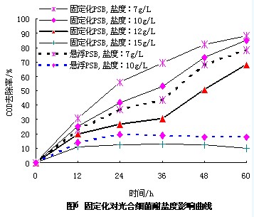 染料(liao)工業廢(fei)水(shui)鹽(yan)度高是造成(cheng)普通活性(xing)污泥無法適應的(de)(de)一(yi)個主(zhu)要(yao)原因(yin)。光(guang)合(he)細(xi)菌(jun)有很強(qiang)的(de)(de)耐(nai)鹽(yan)性(xing),這是光(guang)合(he)細(xi)菌(jun)處理(li)染料(liao)工業廢(fei)水(shui)的(de)(de)優勢之一(yi)。為了研究光(guang)合(he)細(xi)菌(jun)被(bei)固定化(hua)以后,對細(xi)菌(jun)耐(nai)鹽(yan)性(xing)的(de)(de)影(ying)響。配制(zhi)不同鹽(yan)度的(de)(de)酸性(xing)大紅模擬廢(fei)水(shui)(CODCr=2250 mg/L,pH=5.5),測定不同鹽(yan)度(以NaCl計)的(de)(de)條(tiao)件下不同時刻的(de)(de)固定化(hua)光(guang)合(he)細(xi)菌(jun)和懸浮固定化(hua)光(guang)合(he)細(xi)菌(jun)對模擬廢(fei)水(shui)中的(de)(de)CODCr的(de)(de)去除率,結果如(ru)圖6所示。