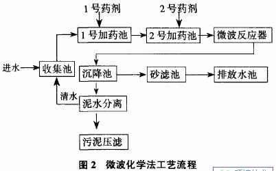 微波化學(xue)法處理廢(fei)水工(gong)藝(yi)是近幾(ji)年(nian)發展起來(lai)的(de)一種新型廢(fei)水處理工(gong)藝(yi)。它利用了(le)微波特有的(de)物理、化學(xue)、生(sheng)物學(xue)效應,配合(he)多種化學(xue)藥(yao)劑(ji),完成對(dui)有機污染物的(de)氧化、分解、吸附、混凝等作用。該方法工(gong)藝(yi)流程如圖(tu)2所(suo)示。