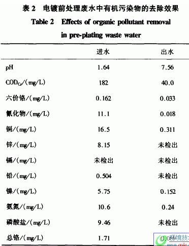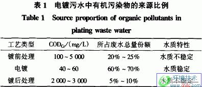 表l為電(dian)(dian)鍍污(wu)水(shui)中有機污(wu)染物的比(bi)例。從(cong)表中可以(yi)看出電(dian)(dian)鍍廢水(shui)中的有機污(wu)染物主(zhu)要來源于(yu)鍍前處理部分,而(er)電(dian)(dian)鍍工藝(yi)本身所占(zhan)比(bi)例較少。