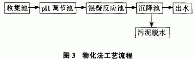 物(wu)化(hua)法工(gong)(gong)藝(yi)試(shi)驗(yan)是由三角環保所工(gong)(gong)作人員(yuan)自行(xing)負(fu)責(ze)設計(ji)的。首先在實驗(yan)室(shi)內對物(wu)化(hua)反應(ying)所需的藥劑(ji)進(jin)行(xing)了(le)大量的篩選(xuan),并(bing)對工(gong)(gong)藝(yi)流程(cheng)及參數(shu)進(jin)行(xing)了(le)優化(hua)組合,其去除(chu)率(lv)為70% ~80%,后又在高平電鍍污(wu)水(shui)廠進(jin)行(xing)了(le)3次1 000 L的小型工(gong)(gong)業化(hua)試(shi)驗(yan),均達到(dao)了(le)較理想的處理結果。該方法工(gong)(gong)藝(yi)流程(cheng)如圖3所示。