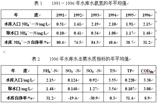 我國南方的一座庫容為3500多萬m3的城市供水水庫,主要依靠廣東東江的水通過80多公里長的輸水明渠和提升泵站組成的引水工程將水輸入該水庫。20世紀90年代以來,由于明渠所經地區有越來越多的生活污水和生產廢水排入渠中,導致進水庫水的水質不斷惡化。水庫雖有一定的自凈能力,但由于水庫的污染負荷受納量超過了水庫自凈能力,長年的污染累積逐漸破壞水庫生態平衡,導致水庫自凈能力逐漸下降。表1顯示1991年至1996年該水庫入口處和位于水庫另端的自來水廠取水口處的各年度氨氮的年平均值,由于入庫水的氨氮連年較高,且越來越差,水庫的氨氮自凈率由1993年以前的80%左右銳降到1996年的30%左右,水庫的生態環境遭到嚴重威脅。表2顯示1996年該水庫入口和水廠取水口的主要污染指標的年平均值。從表2的有關數據可知:由于水庫連續多年超負荷納污,庫中水質已達不容忽視的富營養化程度,必須盡早采取有效措施來改善水庫水質,以有利于從該水庫取水的水廠能提高出廠水水質。