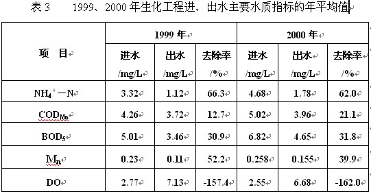 該水庫生化工程投入運行后,1999年及2000年的生化工程進水和出水的氨氮、CODMn、BOD5等水質指標的年平均值和年平均去除率列于表3。由表3可知:雖然水庫入口的水中氨氮及CODMn等指標比1996年的水庫入口水進一步加劇惡化,但由于經生化工程的有效生物降解處理,顯著改善了生化工程出水的水質,明顯減輕了水庫的納污負荷。