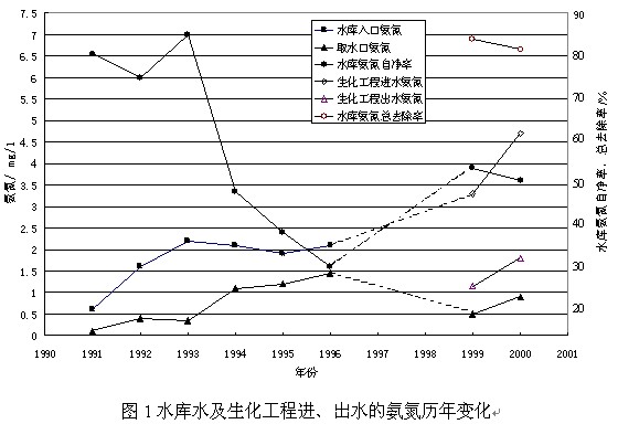 (2) 雖然生化工程投運后的1999年及2000年水庫進水的NH4+-N年平均值比投運前的1996年NH4+-N年平均值高出60%和120%以上,但1999年及2000年生化工程出水的NH4+-N年平均值卻比1996年水庫進水的NH4+-N年平均值還低4.5%和13%以上,可見該生化工程的除污染效果非常突出。
