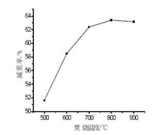 由圖1可知,隨著焚燒溫度由500℃升高到700℃,污泥的減重率也相應地提高。但溫度超過 700℃之后減重率的增幅明顯變小,這主要是因為在低溫時污泥中的水分、揮發份析出、易揮發的金屬揮發和一些可燃有機質的熱解和燃燒造成了污泥的失重。在較高焚燒溫度下,減重率增幅減小,可能是因為污泥樣品中部分物質與空氣中的氧氣發生了反應,生成了穩定的氧化物不再析出。