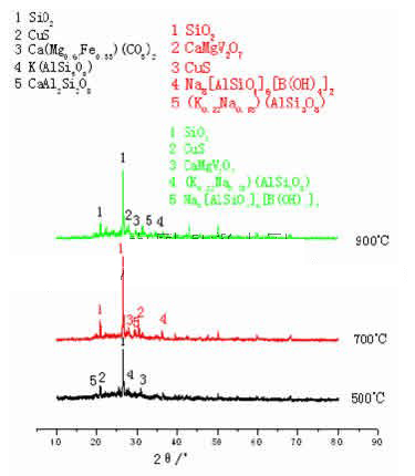 由圖3可知,溫度為500℃時,污泥焚燒灰渣中的主體成分是SiO2、CuS和Ca(Mg0.67Fe0.33)CO3,由于碳酸鹽的不穩定,當溫度升高到700℃時,已經檢測不到Ca(Mg0.67Fe0.33)CO3,說明碳酸鹽已經發生了分解。K(AlSi3O8)和CaAl2Si2O8在500℃時能檢測到,但到了700℃時就檢測不到了,說 明它們只能在低溫時穩定存在,當溫度升高到700℃時已經完全分解了。在全部工況下所得的灰渣中,SiO2都是其中的主要組成部分,而且CuS也一直存在于所有工況下所得的污泥灰渣中。當溫度達到900℃時基本沒有新的物質形成,在700℃時存在的 CaMgV2O7、(K0.22Na0.78)(AlSi3O8)和Na8[AlSiO4]6[B(OH)4]2這些物質在900℃時依然能檢測到,說明它們比較穩定。 Cr元素及其化合物一直是人們關注的對象。劉剛[2]在污泥焚燒灰渣的研究中發現Zn和Cr2O3在500℃、700℃焚燒溫度下,比較容易以ZnCr2O4的形式存在,但在本文的研究中未能檢測到,可能的原因就是Cr元素在污泥中的含量太少,致使污泥灰渣中檢測不出ZnCr204。