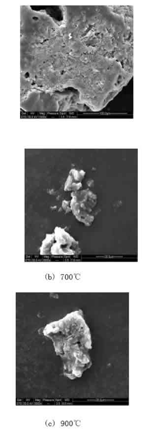 為了更好的說明焚燒溫度對污泥灰渣結構的影響,對不同溫度的污泥焚燒灰渣進行掃描電鏡分析,實驗結果見圖5所示。