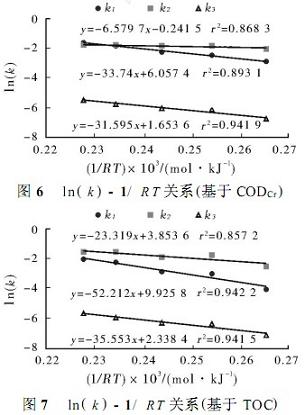 由圖6、7可得表觀活化能Ea和頻率因子A(見表4)。結果表明,基于CODCr的表觀活化能為:有機物氧化成終產物為33.74kJ/mol,氧化成低級酸為6.58kJ/mol,由低級酸氧化成終產物為31.60kJ/mol,可見有機物氧化成低級酸的反應能較快進行,而直接氧化或低級酸氧化成終產物的速度很慢,升高溫度主要加快了后兩種途徑的反應速度。