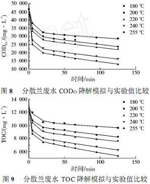 由表4動力學參數預測CODCr和TOC降解情況(見圖8、9,圖中符號為實驗數據,線為模型預測),CODCr和TOC預測值與實驗值相當吻合,CODCr和TOC去除率最大偏差分別為2.00%和1.80%,說明該模型解釋分散蘭廢水的濕式氧化宏觀過程是合理的。
