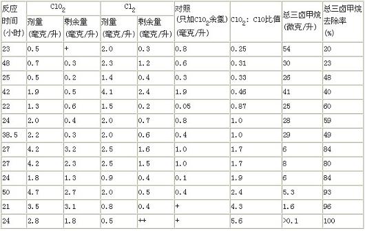 由表1可見,甚至少量的ClO2即可使生成的三鹵甲烷減少20%。相反地有人發現當用3.5及2.4—二羥基苯甲酸,2,4,6-三羥基苯甲酸,3,5-二甲氧苯甲酸(用來研究腐殖氯化反應途徑的模型化合物)與氯化ClO2反應時,氯仿量就增加。
