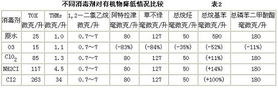 有人用密西西比河水,加入陽離子型高分子絮凝劑混凝后,再經砂濾,然后加入不同消毒劑接觸30分鐘后,測定各種有機物含量。原水含總有機物炭(TOC)約3.0毫克/升,結果見表2。