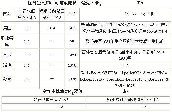 ClO2除用作為消毒劑外,適用于紡織品的漂白。生產車間空氣中常因ClO2發生裝置泄漏而含一定量的ClO2,因之監測車間空氣中ClO2的濃度,排除泄漏就十分必要。制訂空氣中ClO2的容許濃度也屬十分必要。表3為國外空氣中二氧化氯的排放限值。我國尚未訂出空氣中ClO2的排放標準。1986年底,中國紡織大學提出的生產過程排放廢氣中ClO2濃度應符合表4中數值。