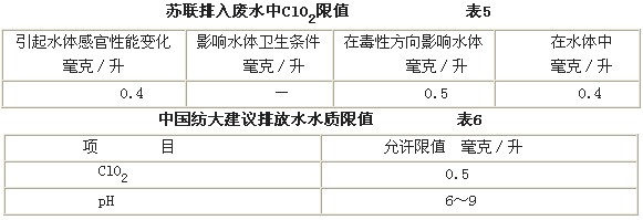 含有ClO2的水或廢水向水體排放的濃度亦需予以規定。蘇聯標準見表5。