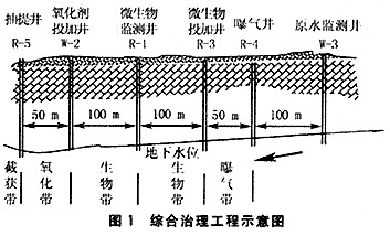 由于研究區的地質構造及水文地質條件復雜,包氣帶及石灰巖含水層石油污染嚴重,任何單一的技術很難在現場達到有效治理。因此,在研究區污染最為嚴重的30×104t乙烯工程所在地5km2范圍內作一試驗性治理示范區,進行污染源控制與實施水力截獲、曝氣、化學氧化以及生物處理等治理技術聯合運行的綜合治理。治理工程示意圖如圖1所示。各井的間距主要由人工流場條件下地下水流動速度、氧化劑治理的可能有效寬度以及微生物的生長速度和治理帶的有效寬度等因素決定。