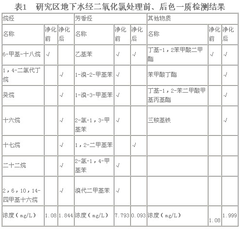 地下水經色—質聯機分析被檢測出的幾十種有機物和經過二氧化氯處理后的測定結果如表1所示。