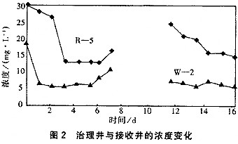 由圖2可見,無論是在治理井W—2還是在接收井R—5中,油類污染物的濃度總體均呈下降趨勢,在第7天因故障而暫停治理后,油類污染物的濃度又呈回升。但繼續處理5天后,水質有所恢復。