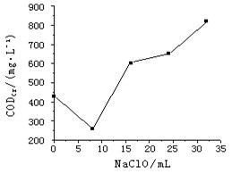 將盛(sheng)有100mL水(shui)樣的(de)(de)燒杯放置磁力攪拌器上,加入一定(ding)量的(de)(de)NaClO,調節(jie)溶液的(de)(de)pH,反應一定(ding)時間后,取(qu)水(shui)樣測(ce)定(ding)其CODCr和色度[1],計(ji)算二者的(de)(de)去除率。然后使該水(shui)樣通過活性炭固定(ding)床,并(bing)對流出(chu)(chu)液進行CODCr和色度的(de)(de)測(ce)定(ding)。因水(shui)樣中含有較(jiao)多(duo)Cl-,采用(yong)CIC-100離子(zi)色譜儀(yi)測(ce)出(chu)(chu)Cl-的(de)(de)具體濃度,根(gen)據該濃度配(pei)制NaCl溶液,測(ce)其CODCr,通過差量法即可(ke)得出(chu)(chu)CODCr的(de)(de)真實值。