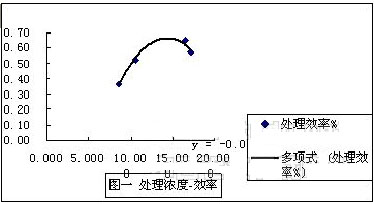 由圖可以得出(chu),濃度變化時處(chu)(chu)理(li)效(xiao)率也相應的變動,由圖表可以得出(chu)方程(cheng):y=-0.0091×X2+0.261X-1.2062 由此可以積分知道最佳的濃度是(shi)(shi)14.5mg/l,此時的處(chu)(chu)理(li)效(xiao)率最高是(shi)(shi)66.5%。
