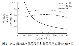 pH對脫硫量的影響見圖1。從圖1可見,pH對脫硫量有較大的影響,且存在最佳值。根據圖1推測以及式(8)、式(9)、式(11)和式(2)的計算可知,不同的PAC投加量時,Y(Z)—pH曲線也是一組平行線。