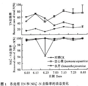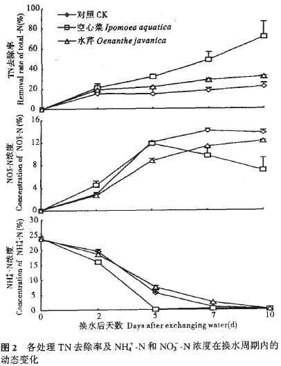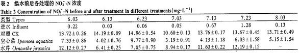 浮床空心菜和水芹對TN的去除效果較對照顯著。各處理包括對照對NH:。N的去除率均很高,多數時候大于98%,NH:一N的濃度從進水的高濃度下降到幾乎難以檢出(圖1)。由于換水前后的NOr—N濃度變化較大,用去除率難以表達其變化情況,因而將其值列于表2。由表2可以看出,處理后的NO;一N濃度急劇增加,表明在培養箱內的硝化反應將大部分NHf—N轉化成NOr—N。
