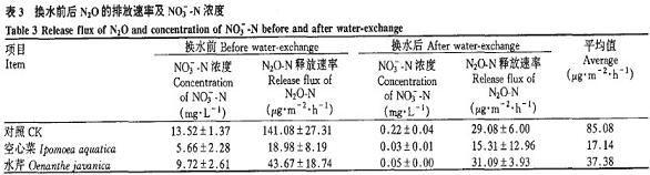 換水前,無植物系統的N20排放速率遠高于有植物系統,分別為浮床空心菜和水芹系統的7.43和3.23倍,其中水芹系統的N:O排放速率是空心菜系統的2.30倍(表3)。換水后,仍以空心菜系統的N20排放速率最低,浮床水芹和對照系統的排放量都是空心菜系統的2倍左右。浮床系統排水前后平均N20的排放通量達到17.04~85.08颼N·m-2·h~,這個值在水田土壤[29]、湖泊沉積物[21]和緩沖區[19]中的觀測值范圍內,但要低于營養液栽培植物中的觀測值。營養液栽培系統中N,O的排放通量一般為農田土壤的5~10倍[5]。
