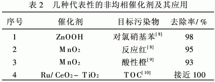 催化劑主要有金屬、金屬氧化物、金屬負載催化劑、金屬氧化物負載催化劑四種。金屬及負載型金屬催化劑可處理的污染物有甲酸、水楊酸等有機 酸以及酚類、苯衍生物等。金屬氧化物及負載型金屬氧化物催化劑可處理的污染物主要有有機酸、酚類、苯及苯系物、環氧烷烴、苯衍生物及偶氮等染料的脫色[7]等,幾種代表性的非均相催化劑及其處理效果見表2。