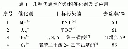 常用的均相催化劑為過渡金屬離子催化劑,主 要有Fe2+、Mn2+、Ni2+、Co2+、Cd2+、Cu2+、Ag+、 Cr3+、Zn2+等。利用均相催化臭氧化進行水處理時,水中加入的過渡金屬離子催化劑,會引發臭氧 分解產生超氧自由基O-2?,進一步發生電子轉移 生成O-3?,隨后產生高氧化性的HO?,這些自由 基容易與水中的有機污染物反應,使水體中的有機 污染物氧化降解成低毒或無毒的小分子物質,可以 用于印染廢水、農藥生產廢水、造紙廢水、含表面活 性劑廢水和石油化工廢水的處理,表1列出了幾種代表性的均相催化劑及其應用。