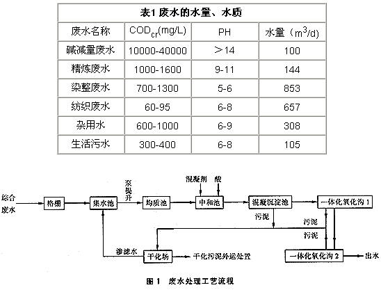 物化法和生化法聯合使用是處理印染廢水常規的典型工藝〔1〕。混凝沉淀具有脫色和去除懸浮物能力強的特點,同時所投加的混凝劑也可以起到一定的調節pH作用。生化法對溶解性的有機物去除能力強。在本工程中,由于廢水中的主要污染物在pH為6~9條件下為難溶性的對苯二甲酸和各種分散染料等,因此綜合廢水先經混凝沉淀,可有效地去除有機污染物、色度和調節pH值,并提高廢水的生化性能,為后續生化處理創造有利條件。生化法采用 氧化溝工藝,適用于該印染廢水水質特點和對出水水質高的要求。